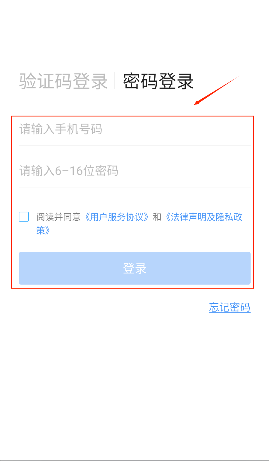 2、如果选择密码登录需要先输入注册时使用的手机号码,然后在密码框输入6到16位的登录密码,点击右侧眼睛图标可以查看密码。