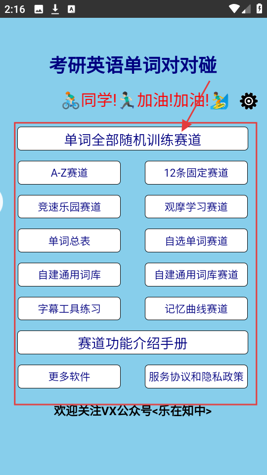 1、进入考研英语单词对对碰主界面,有多种赛道可选,如【单词全部随机训练赛道】【A-Z赛道】等,选合适赛道开始学习。