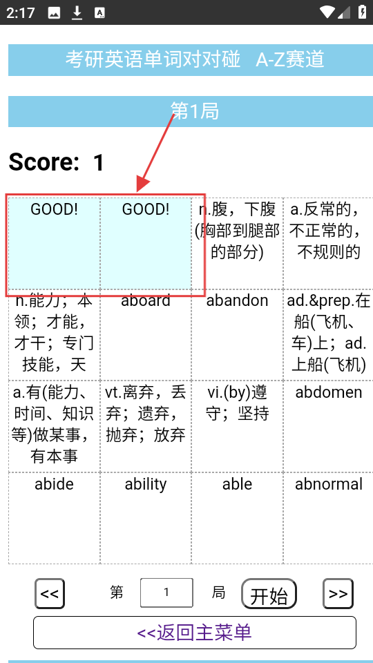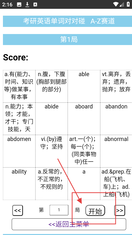 2、进入A-Z赛道第1局,界面有单词及释义,点【开始】,开启本局单词对对碰游戏。