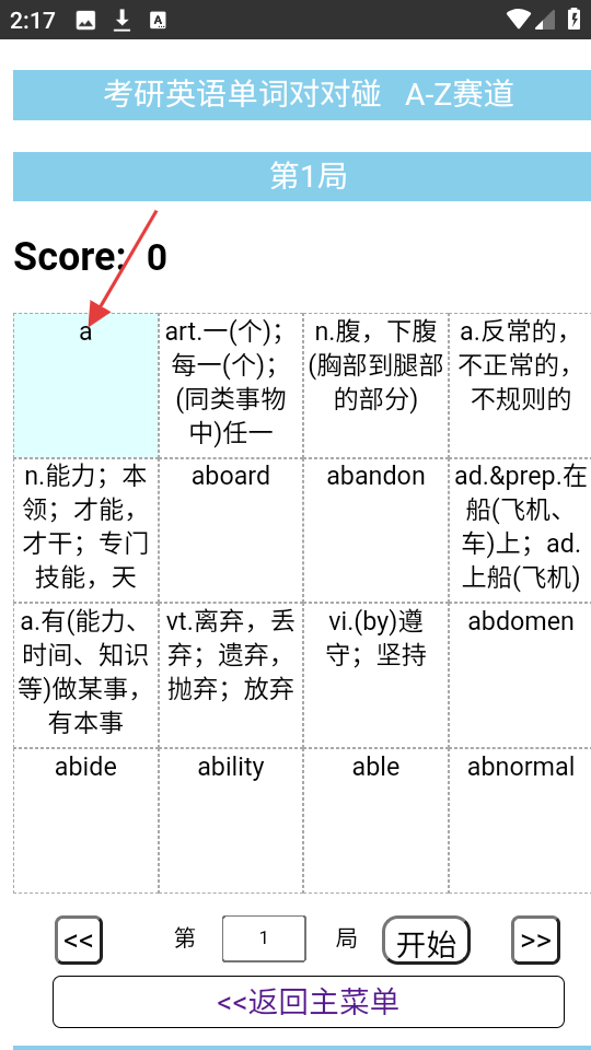 3、游戏开始后,点击含【a】的方格,然后寻找与之匹配的单词或释义方格,完成配对。