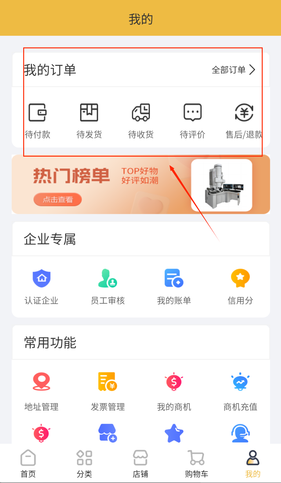 4、个人中心集中管理所有订单状态,可以查看物流信息、申请售后服务、开具电子发票等,还能设置采购偏好接收个性化商机推送。