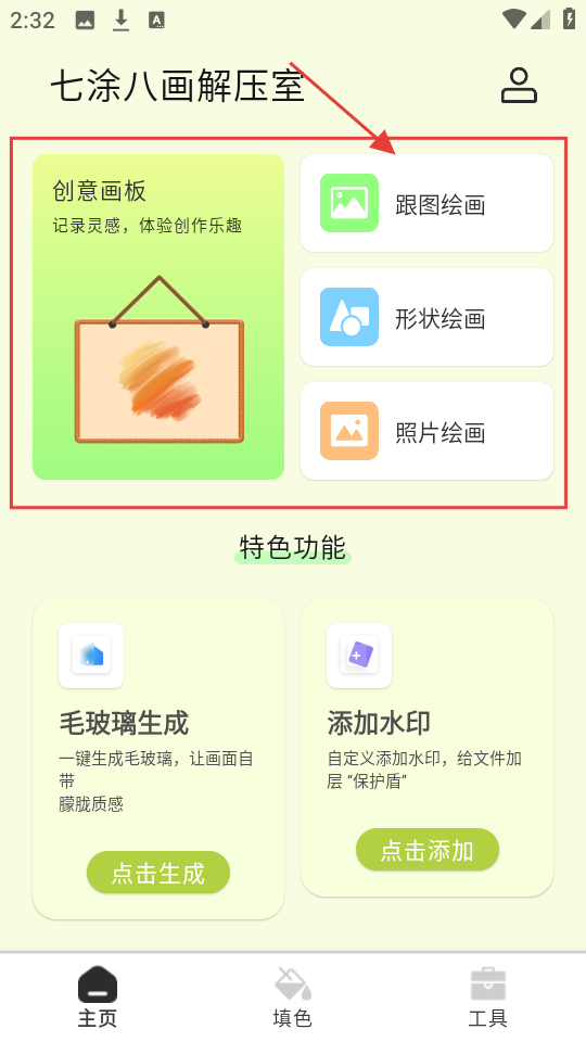 1、进入七涂八画解压室主页,有【创意画板】【跟图绘画】等功能,选喜欢的绘画方式,开启创作。