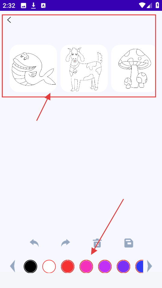 2、在绘画页,有鲸鱼、山羊等图案,选喜欢的图案,再选颜色,给图案填色,享受绘画乐趣。