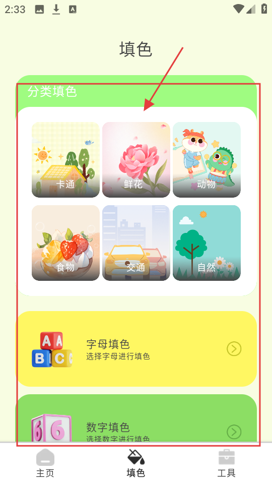 3、切换到填色页,有卡通、鲜花等分类填色,还有字母、数字填色,选感兴趣的分类,开始填色。