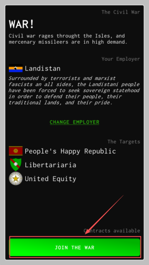 2、如何加入战争?查看雇主与目标信息,点击“JOIN THE WAR”确认参战。