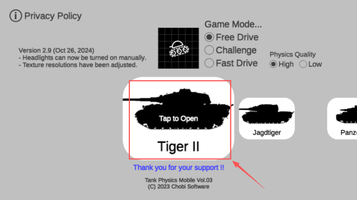 4、如何进入坦克选择?点击"TaptoOpen"即可展开"Jagdtiger、Tiger II"等坦克列表,选中后即刻开始驾驶。