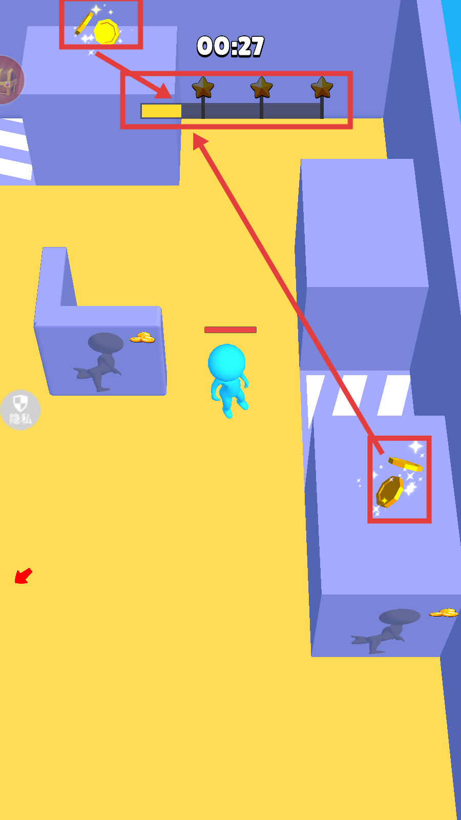 3、在场景中移动时,要收集【金币】等道具,它们能推进上方进度条,助力游戏进程,需抓紧时间收集。