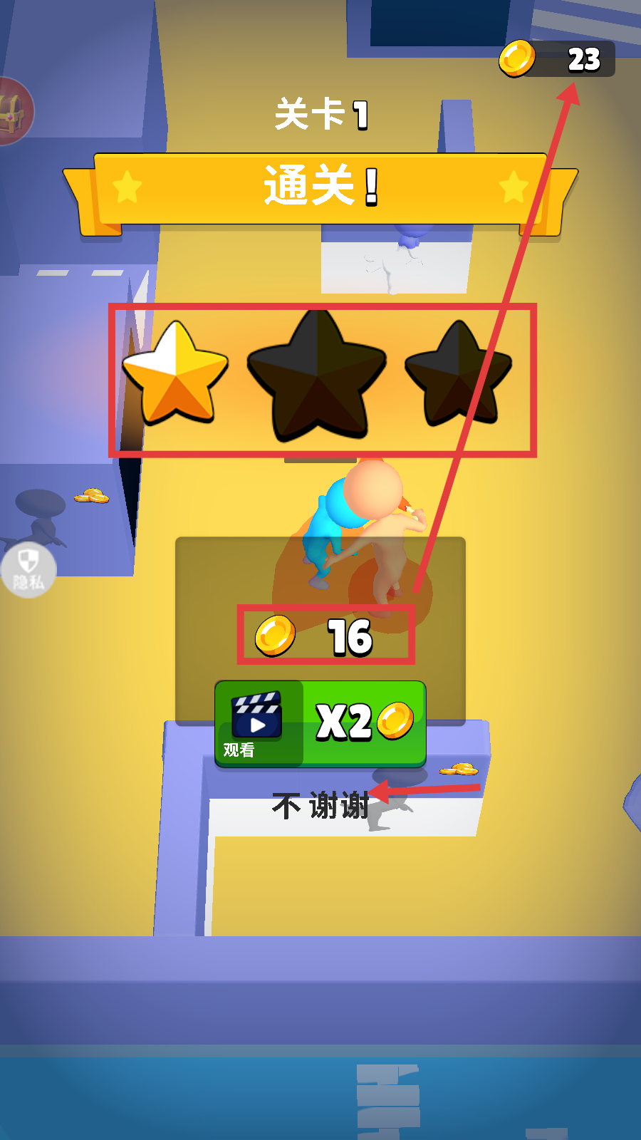 4、通关【关卡1】后,可获得【16】金币奖励,若不想观看视频翻倍奖励,点击【不谢谢】即可,后续可提升星级评价。