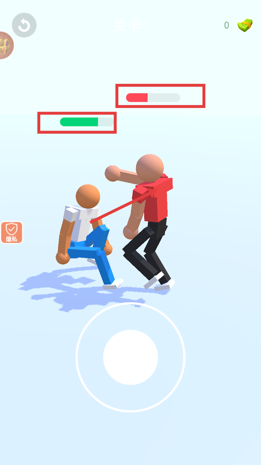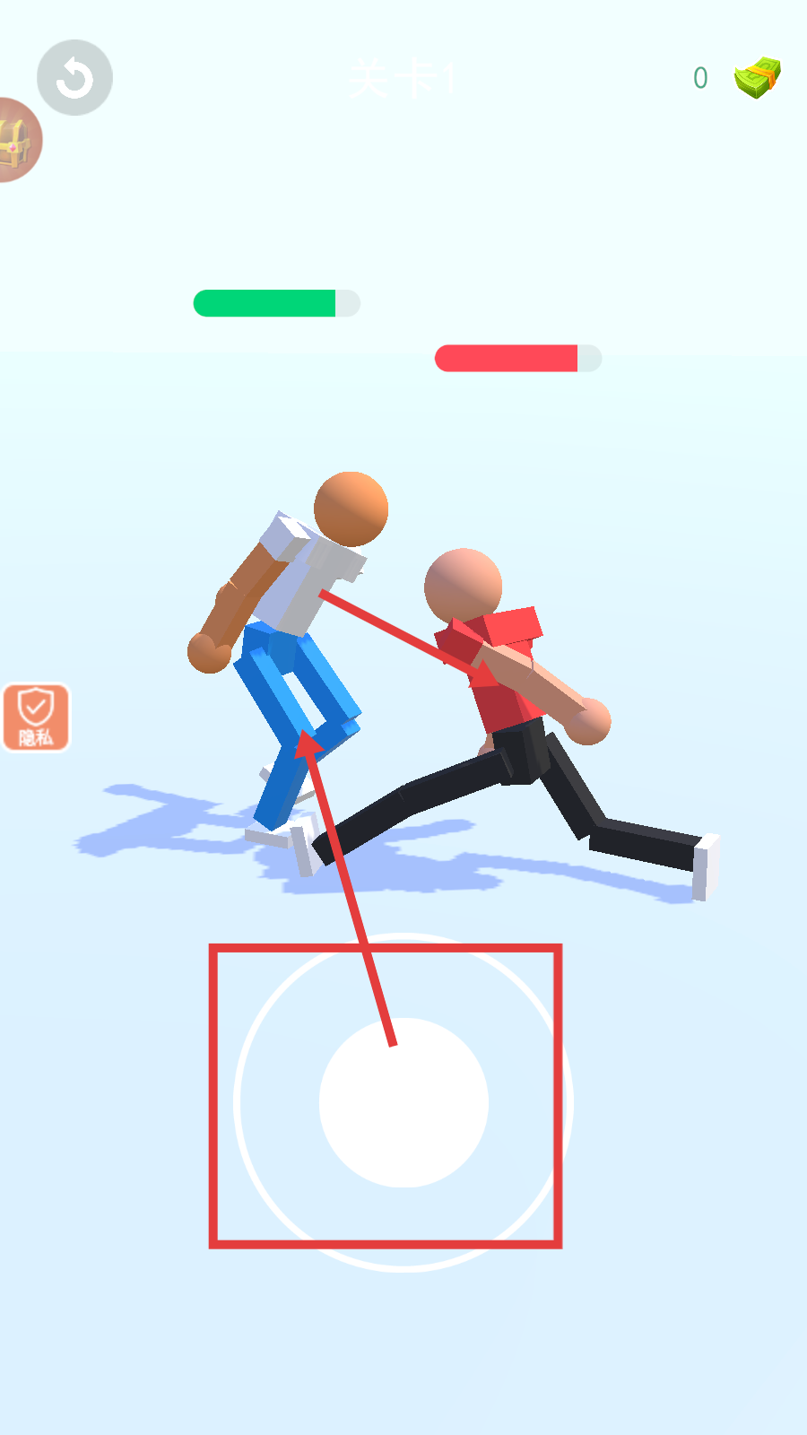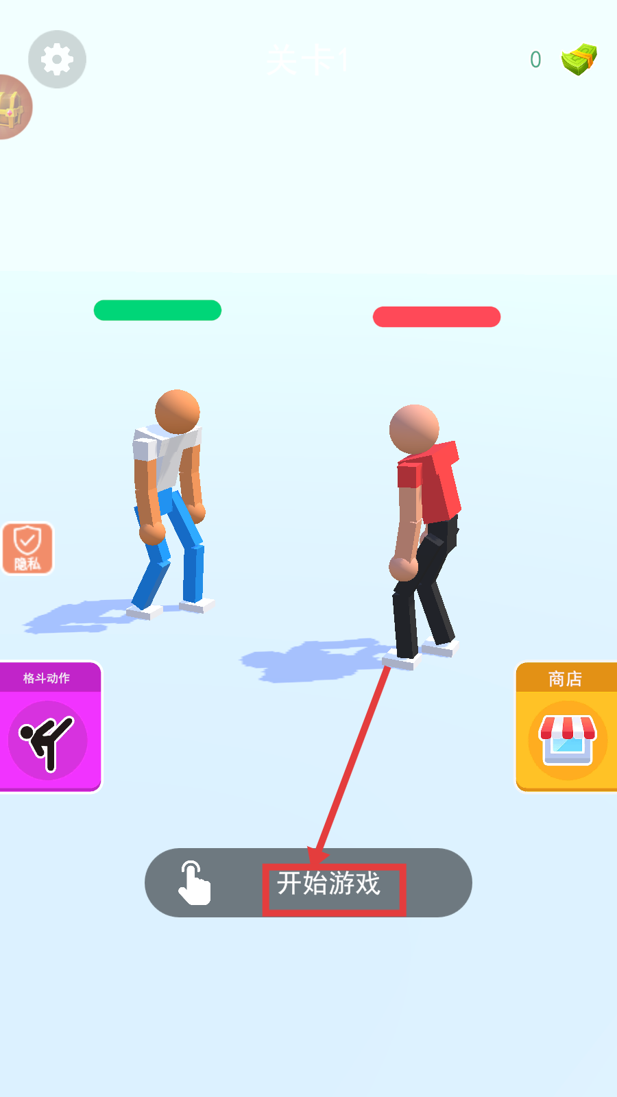 1、进入【关卡1】,点击【开始游戏】按钮开启格斗挑战,还可留意左侧【格斗动作】与右侧【商店】功能。