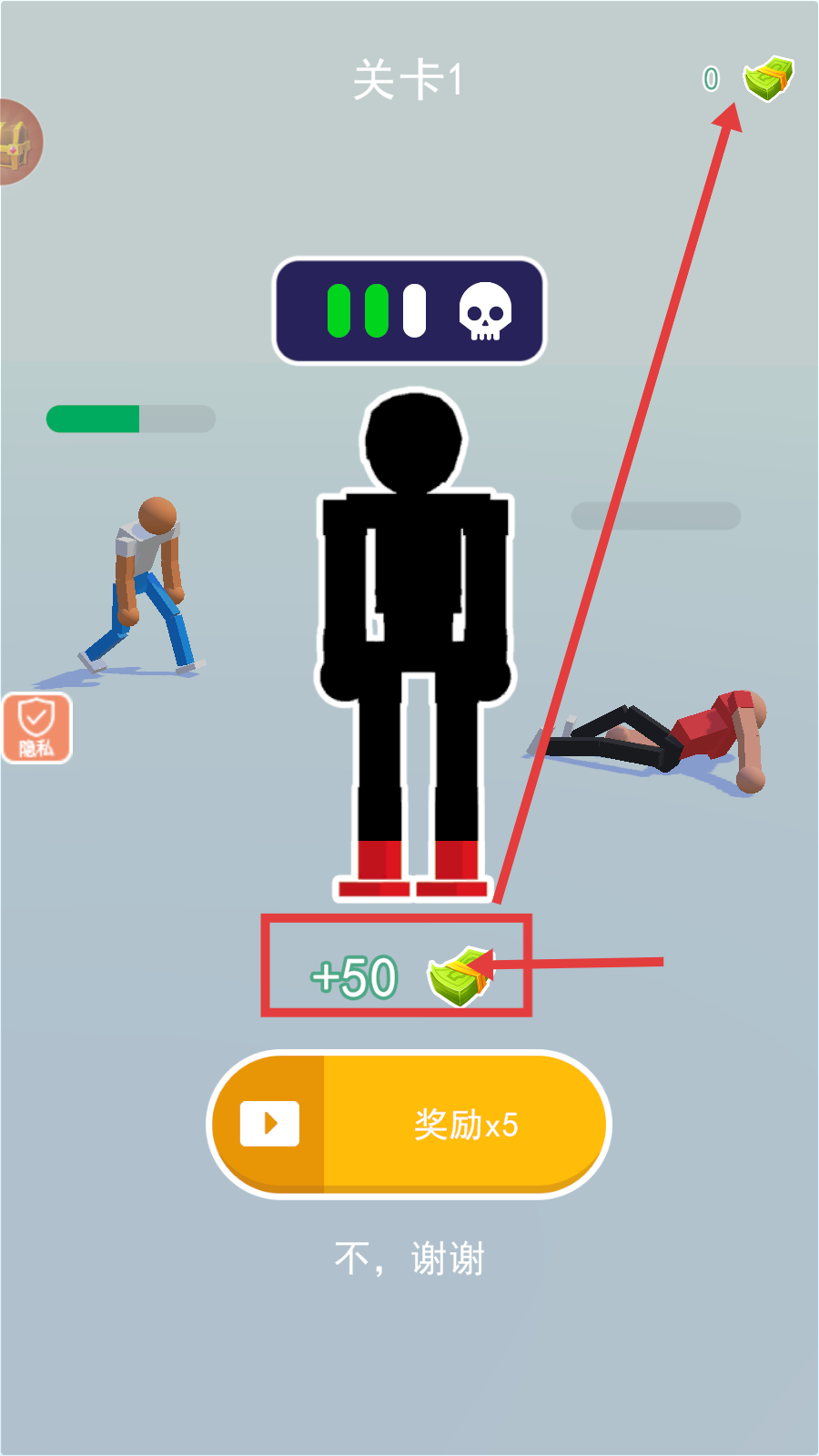 4、击败敌人通关【关卡1】后,能获得【+50】绿色钞票奖励,若不想看视频翻倍奖励,选【不,谢谢】即可,奖励可用于后续养成。