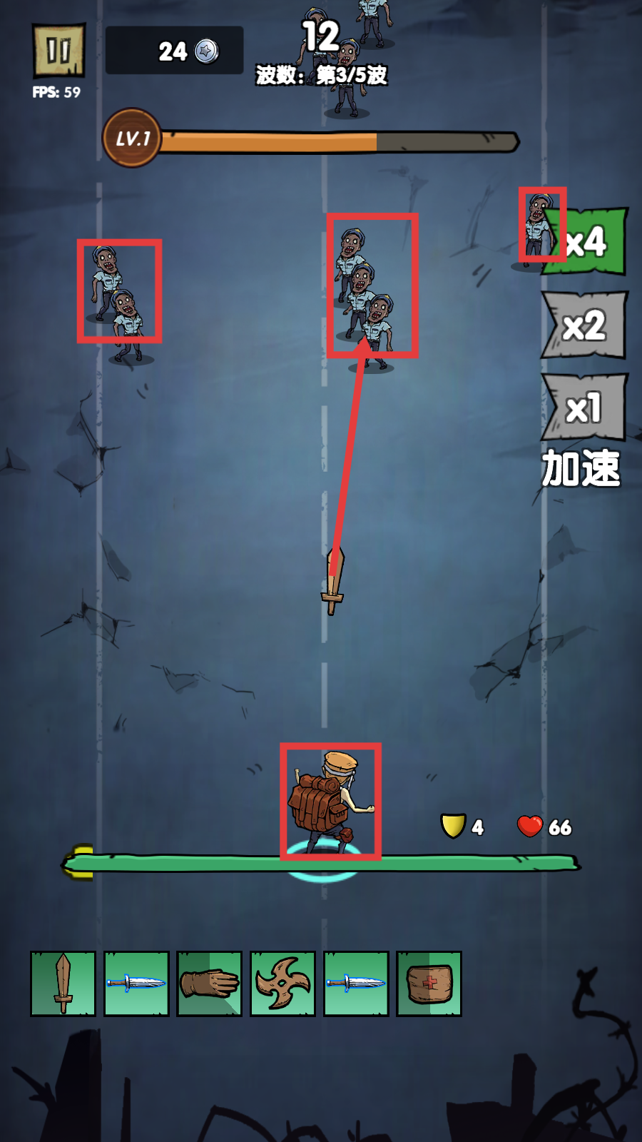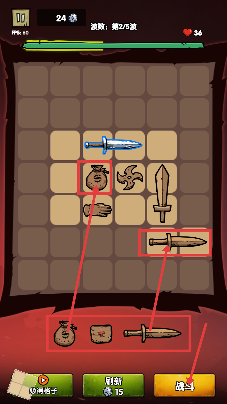 1、波数-第2/5波时,将下方金币袋、木剑等装备与上方对应道具组合,搭配完毕后点击【战斗】按钮进入战斗。