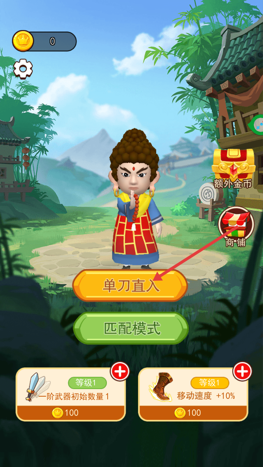 1、进入游戏后,可点击【单刀直入】按钮快速开启战斗,也能通过【商铺】提升武器或移动速度等属性。