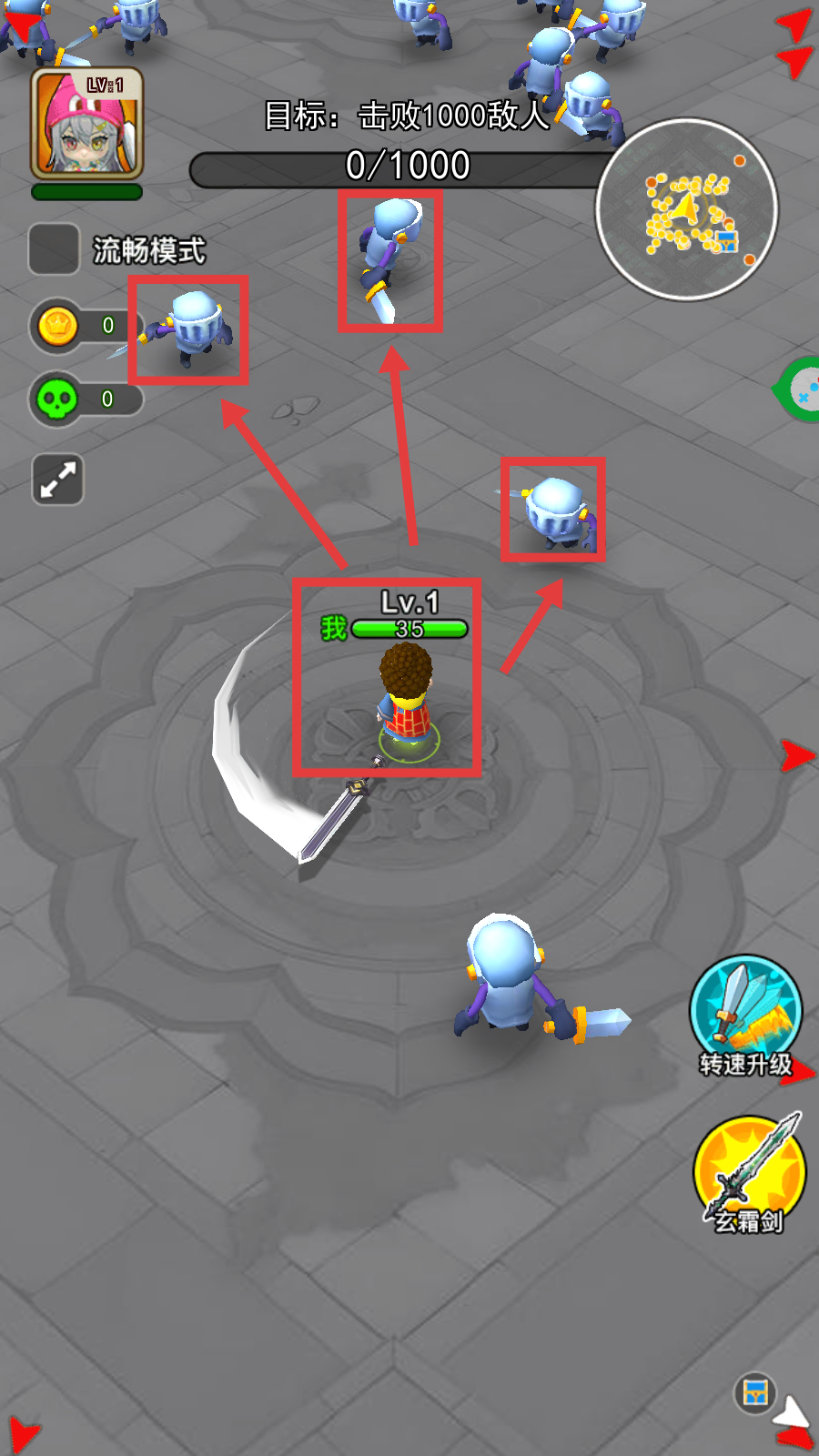 2、战斗时操控角色(Lv.1)攻击周围蓝色小兵,目标是击败1000敌人,可利用武器的攻击范围高效清怪。