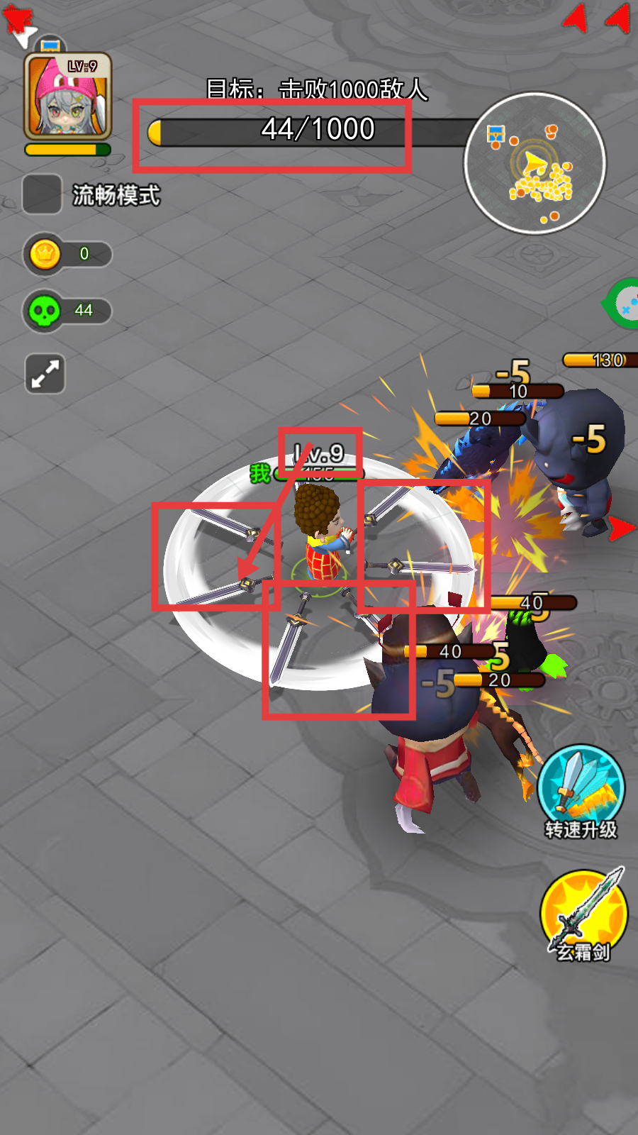 3、升级后(如Lv.9),角色会解锁多剑环绕等强力技能,借助这些技能能更快击败敌人,推进【44/1000】的进度。