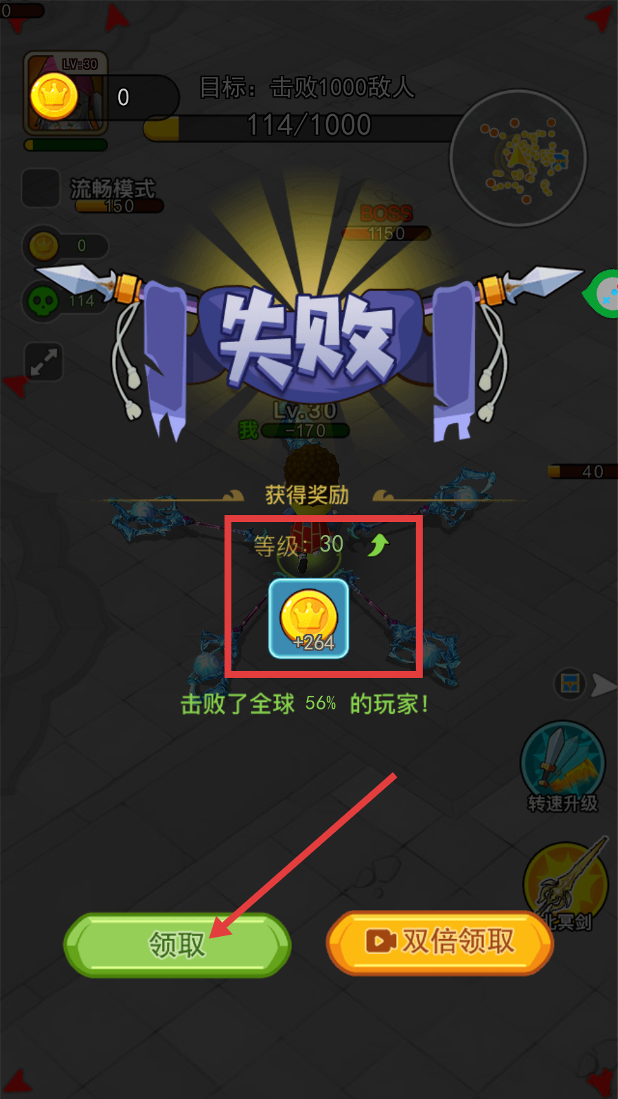 4、若战斗失败,界面会显示【失败】,此时可点击【领取】按钮获取金币奖励(如+264),也可选择双倍领取来获得更多资源。