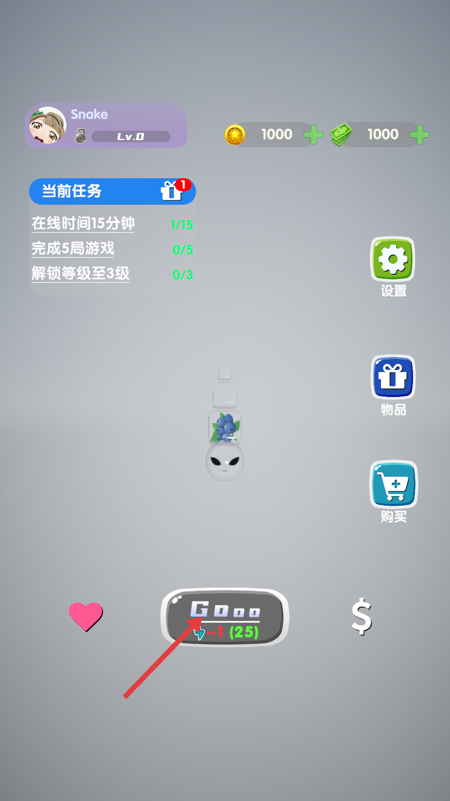 1、主界面需留意【当前任务】的在线时间、游戏局数、等级解锁目标,点击【Gooo】按钮开启游戏,也可使用金币、绿钞在【购买】处强化。