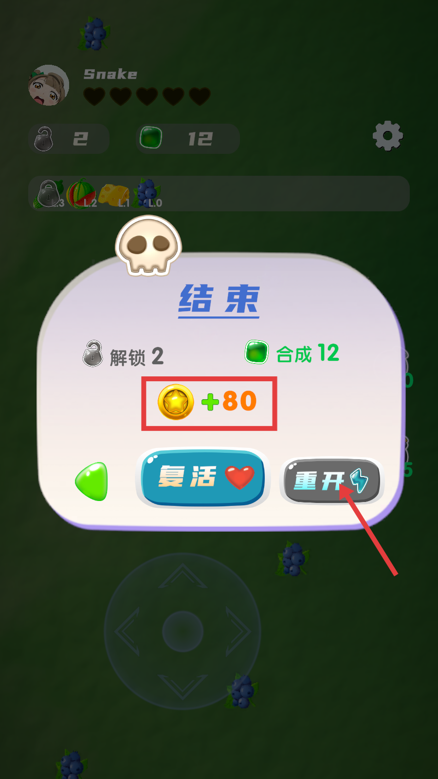 4、挑战结束后,能获得【+80】金币奖励,若想重新挑战,点击【重开】按钮即可再次进入游戏继续体验。