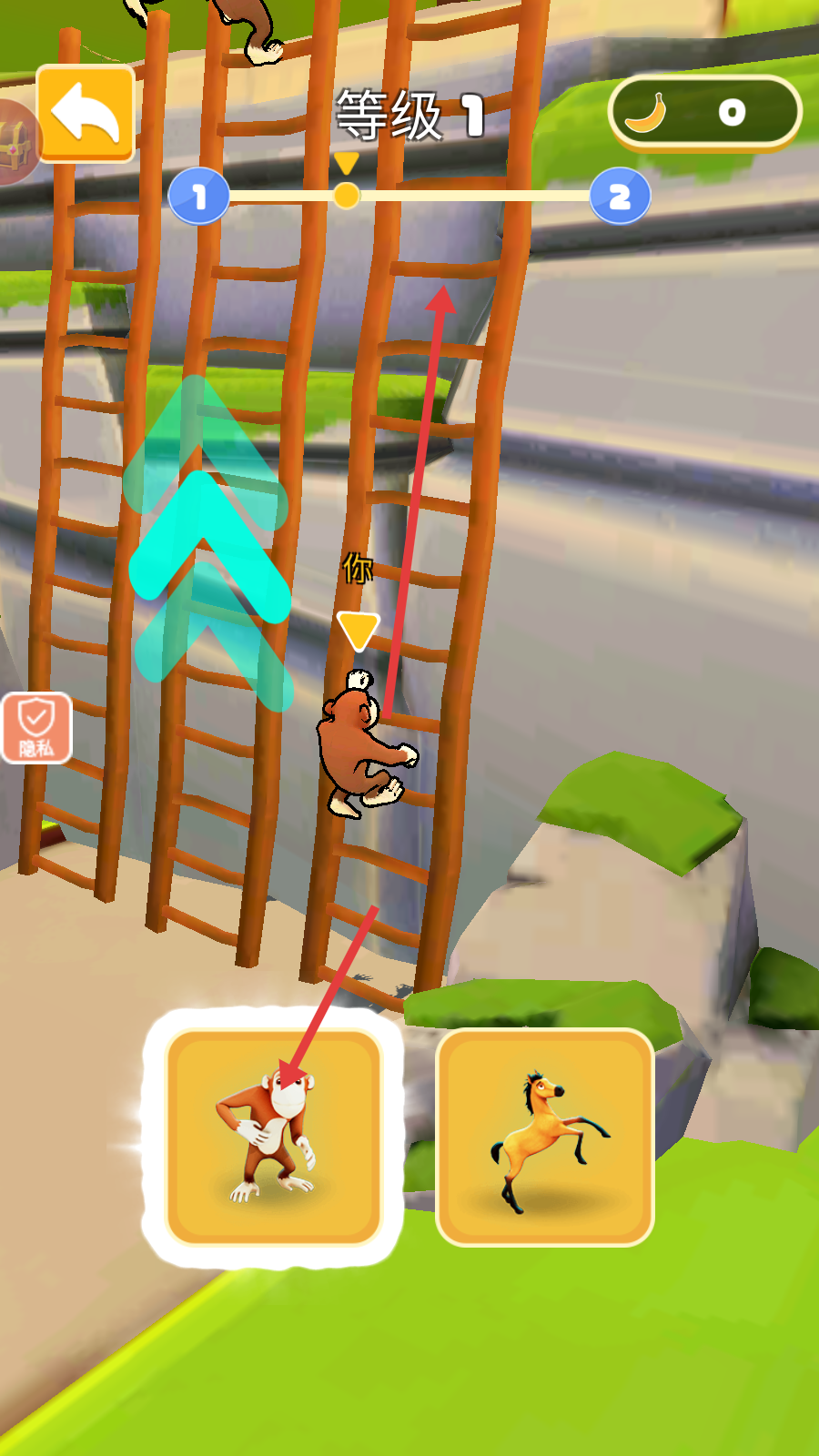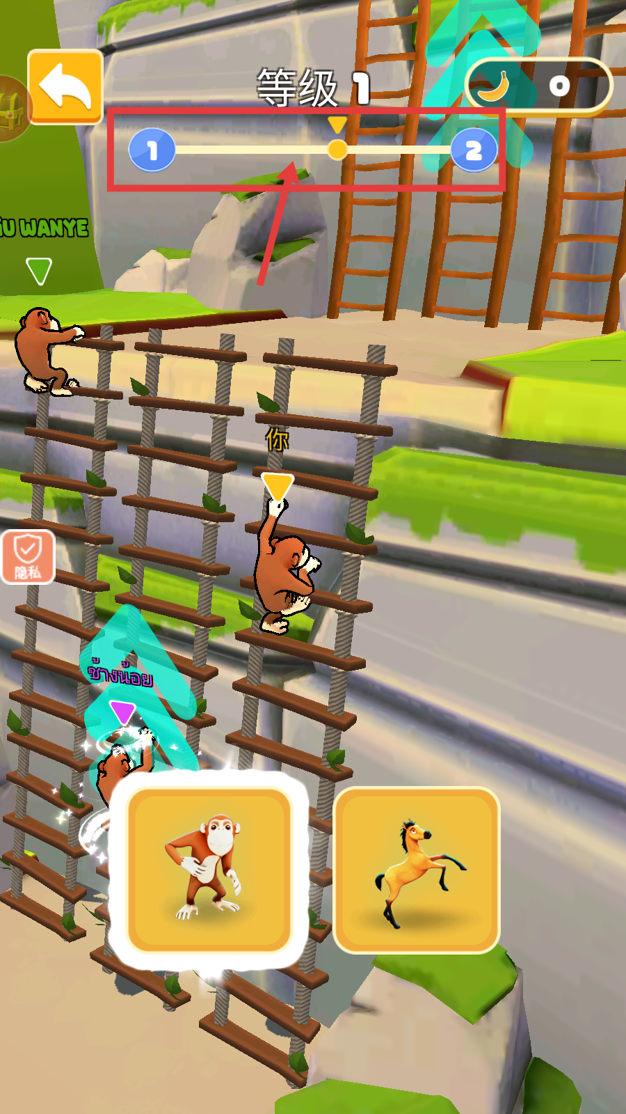 2、挑战中选择猴子形象,操控它沿着橙色梯子向上移动,尽量保持领先,推进游戏进程。