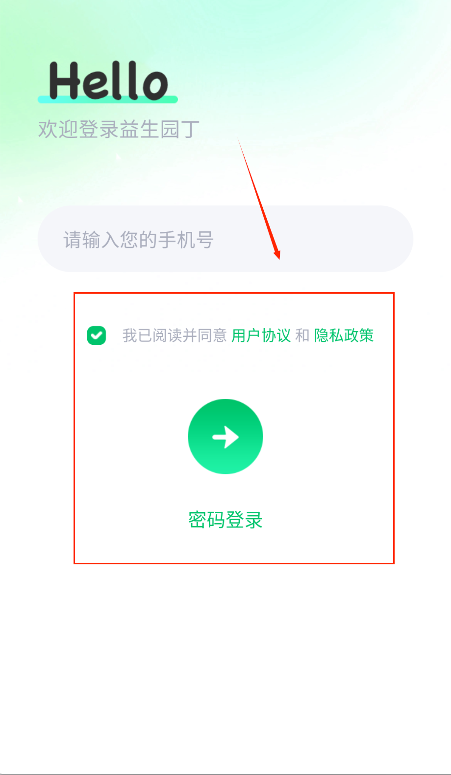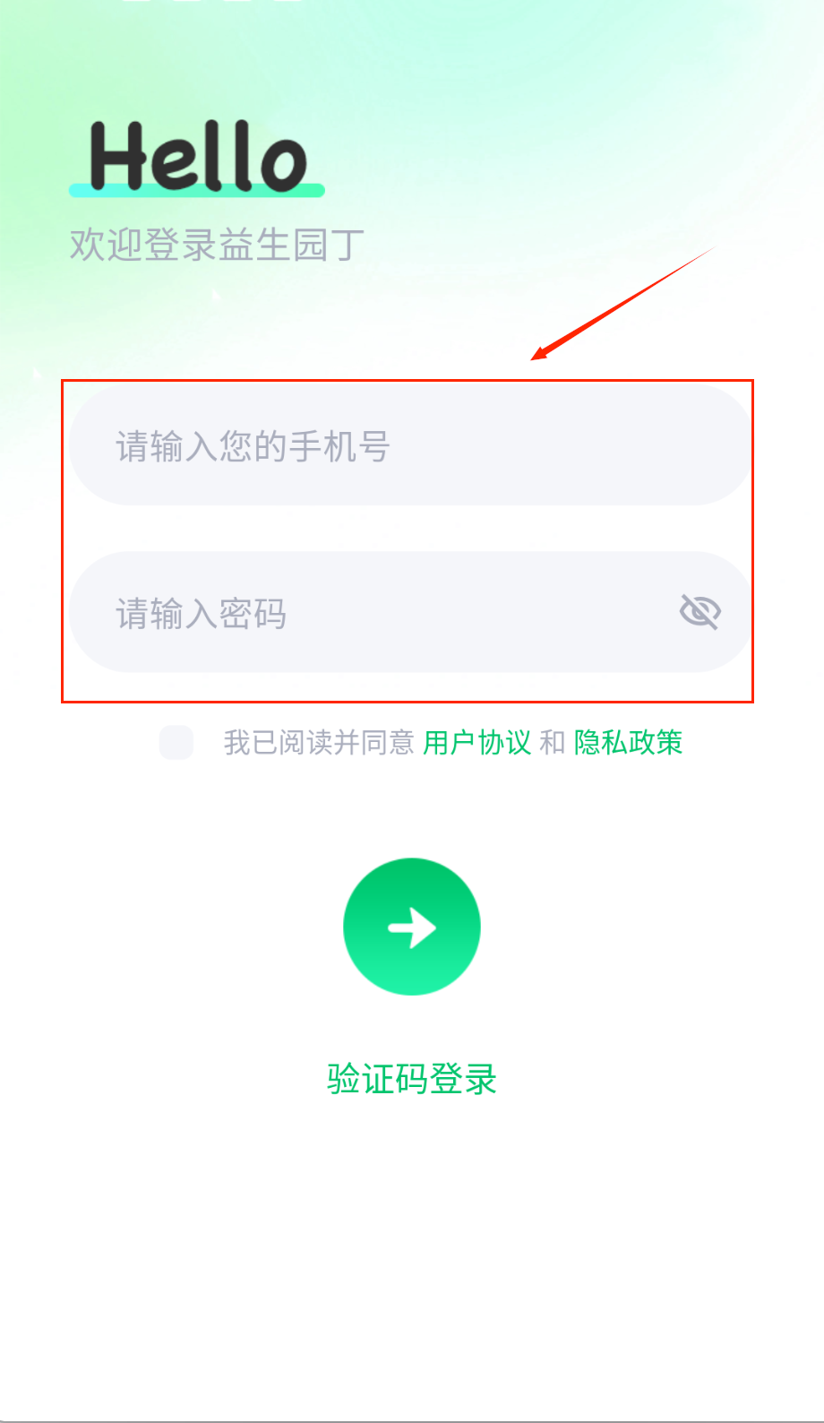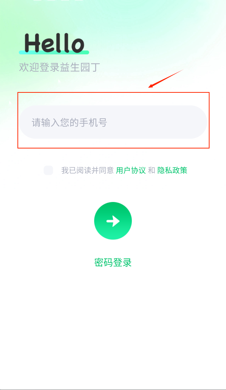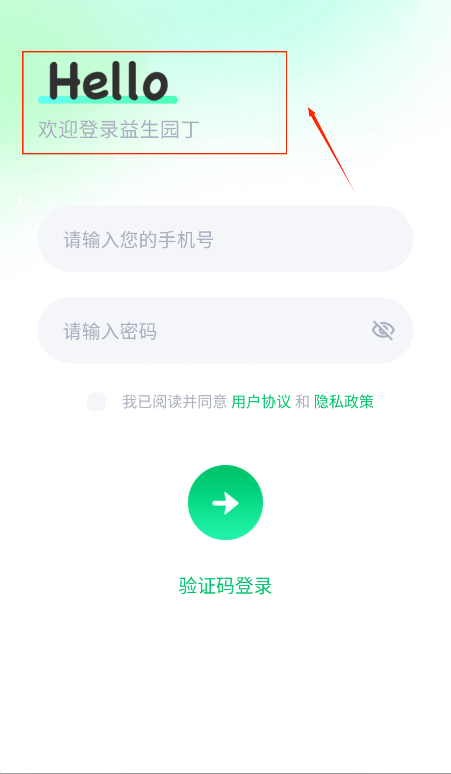 1、打开软件就能看到淡绿色的渐变背景啦,屏幕顶部显示着当前时间,中间大大的Hello字样下面写着欢迎登录益生园丁。