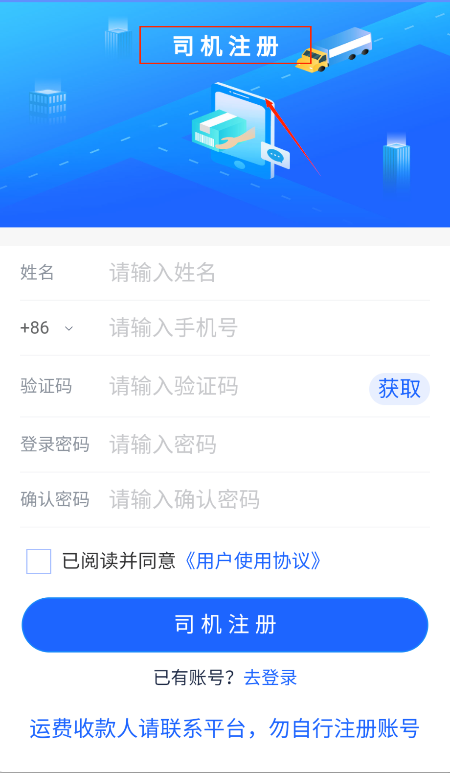 2、新司机需要先完成注册才能登录呢,在注册页面填写真实姓名和手机号,获取短信验证码后设置登录密码,记得勾选同意用户协议。