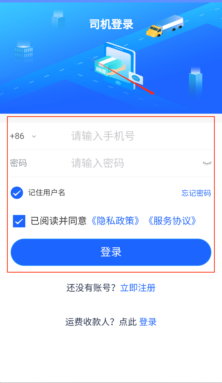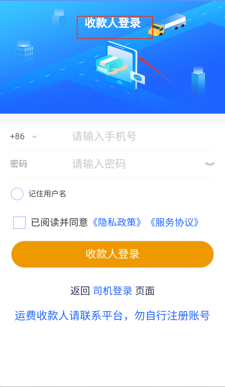 3、如果是负责运费的收款人员需要登录,要特别注意选择收款人登录入口而不是司机登录,输入平台分配的手机号和密码登录。