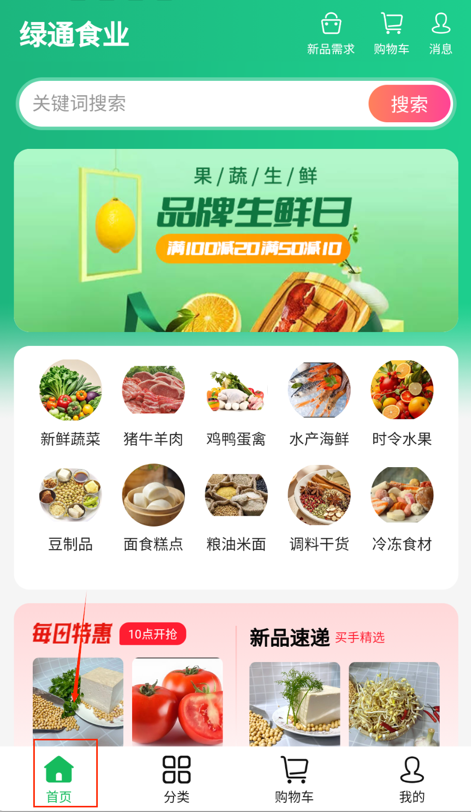 1、打开应用浏览首页推荐商品,通过分类导航筛选蔬菜、肉类等品类,查看当日特惠活动与限时折扣。