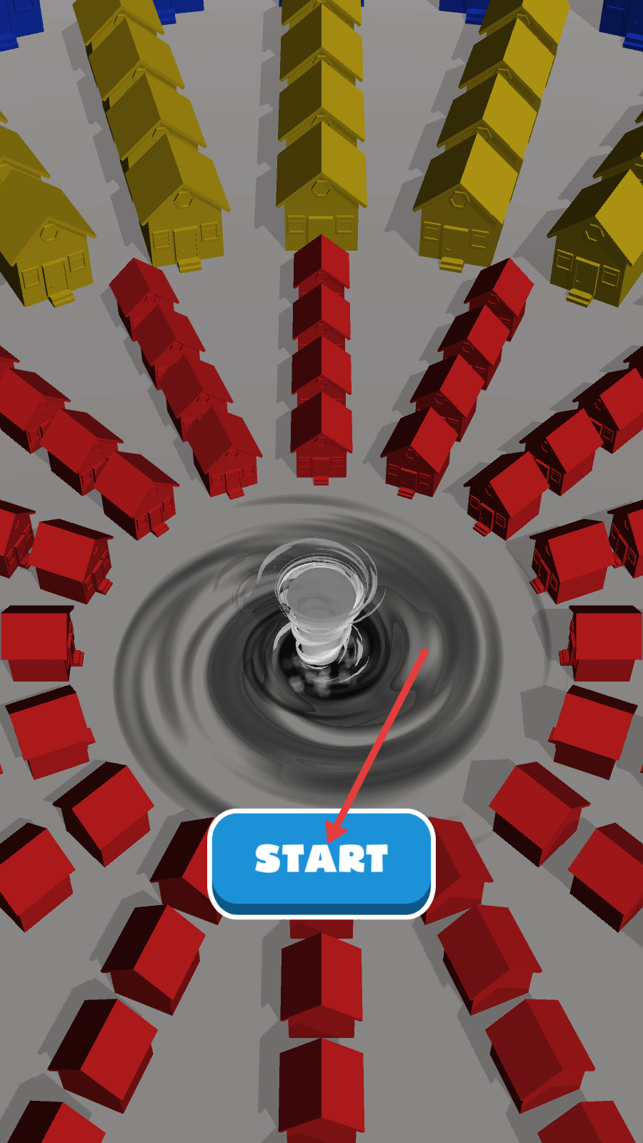 1、点击【START】按钮开始游戏,操控龙卷风进入由红黄房子组成的区域,开启破坏与收集金币的挑战。