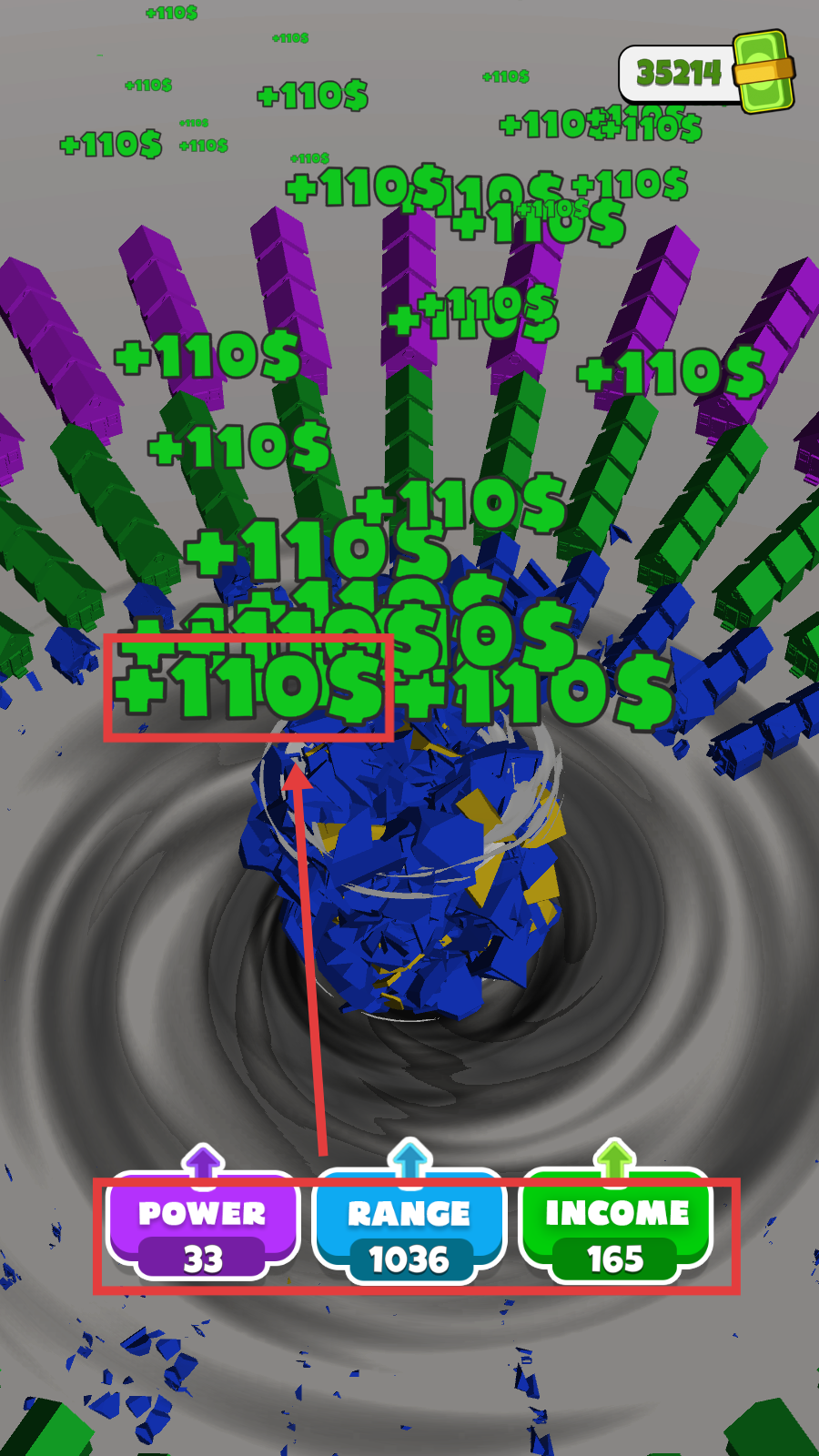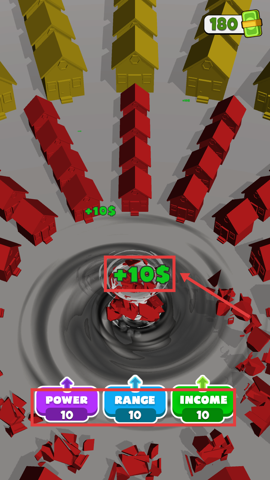 2、龙卷风摧毁红色房子时,会获得【+10$】,同时可升级【POWER】【RANGE】【INCOME】这三个属性,提升后续破坏效率。