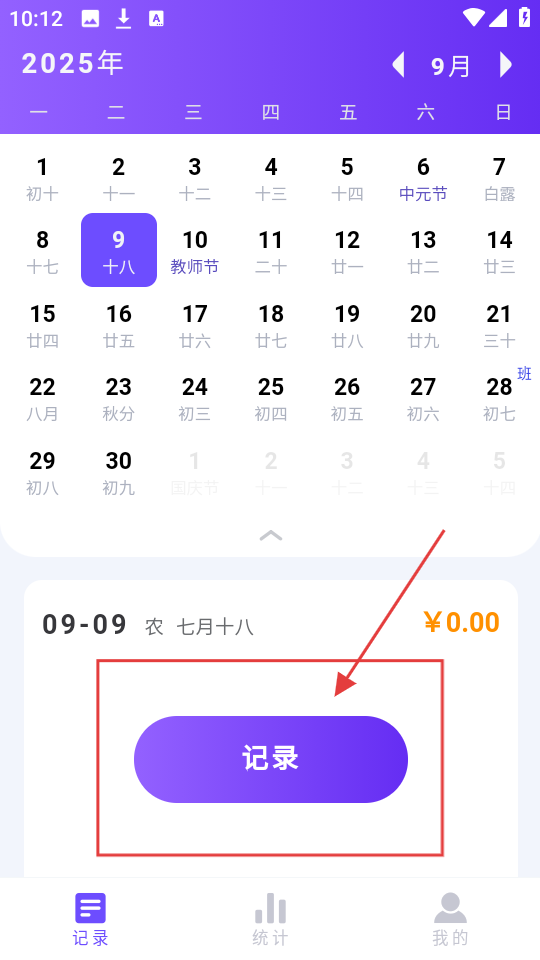 1、在日历界面,选好日期,点【记录】按钮,进入记录编辑页面,开始记录当天相关内容。