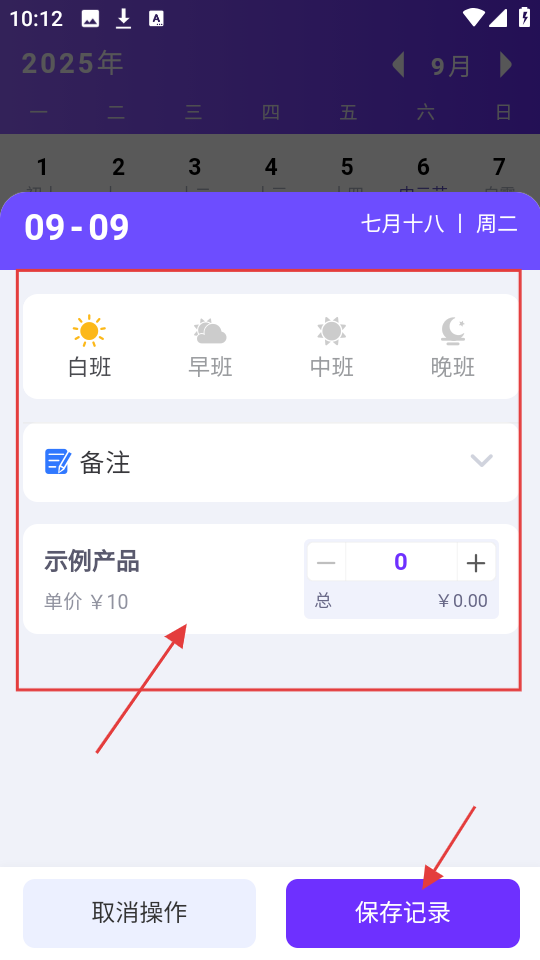 2、在记录编辑页,选班次,填备注,设置示例产品数量,确认信息无误后,点【保存记录】,完成记录保存。