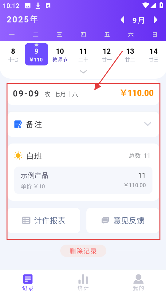 3、保存记录后,回到日期界面,可看到当天记录的总金额等信息,还有计件报表、意见反馈等功能,按需使用。