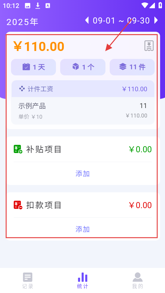 4、进入统计页面,能看到一段时间内的总金额、天数、产品数等统计数据,还可添加补贴、扣款项目,完善统计内容。