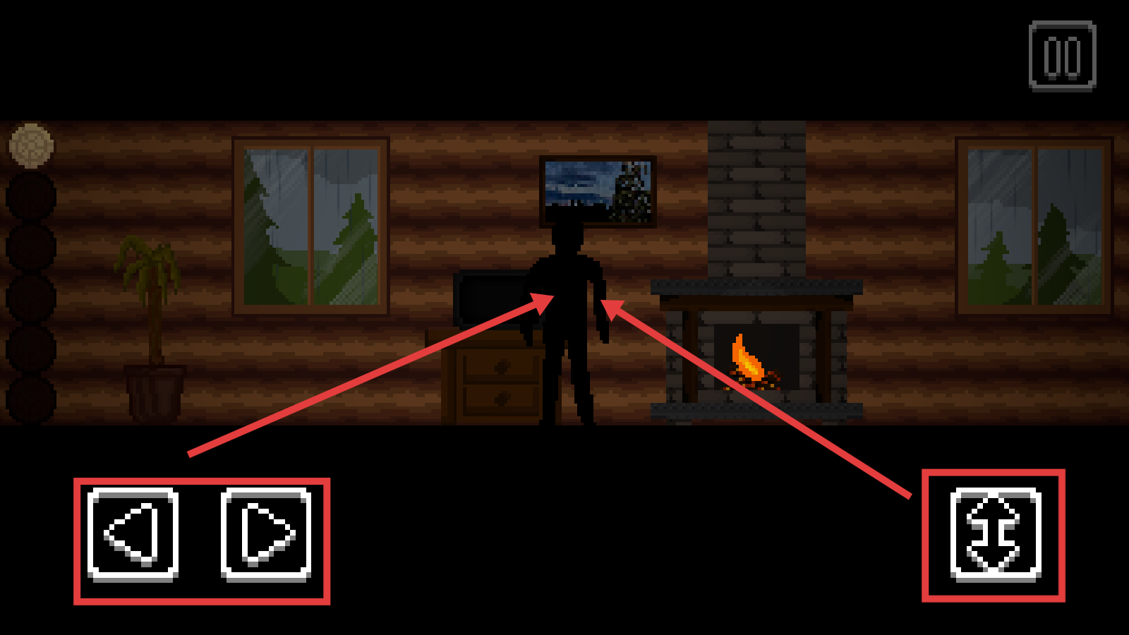 2、在木屋中,通过左侧左右箭头按钮控制角色移动,用右侧互动按钮,探索壁炉、电视等区域。