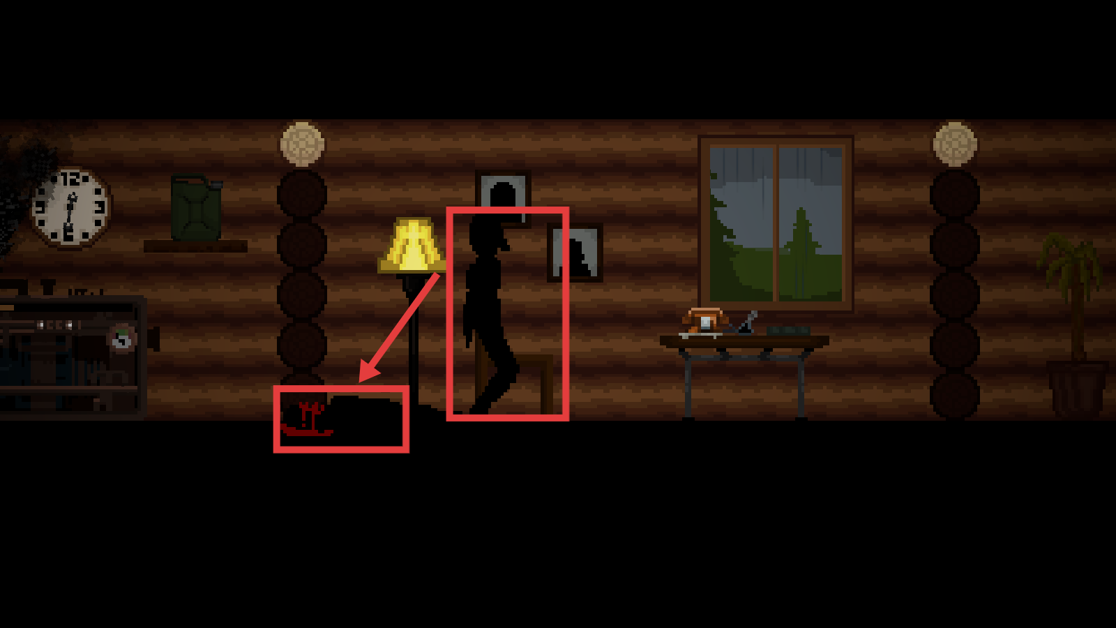 4、继续探索木屋,关注房间内的血迹等线索,与台灯旁的区域互动,解锁更多游戏内容。