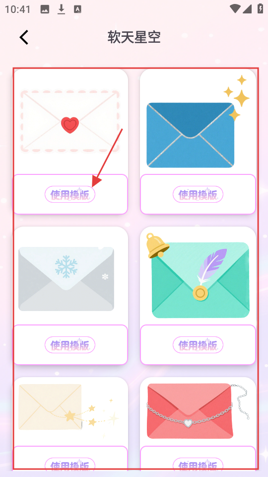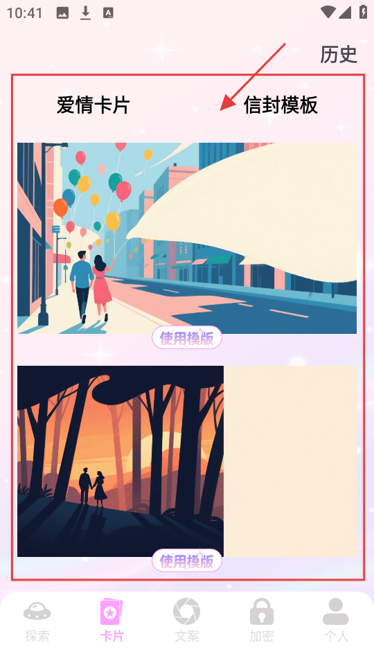 1、进入卡片页,有【爱情卡片】【信封模板】等,选喜欢的爱情卡片模板,点【使用模版】,开始制作卡片。