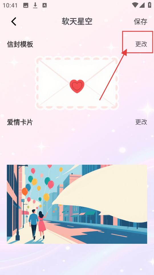 2、在卡片编辑页,信封模板和爱情卡片都可【更改】,点信封模板旁的【更改】,进入信封模板选择页。