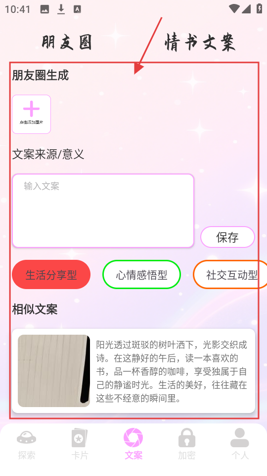 4、进入文案页,可生成朋友圈内容,添加图片,输入文案,选文案类型,还能看相似文案,保存心仪文案。