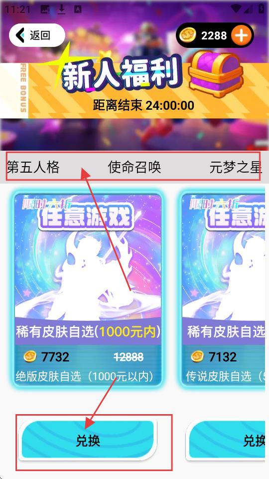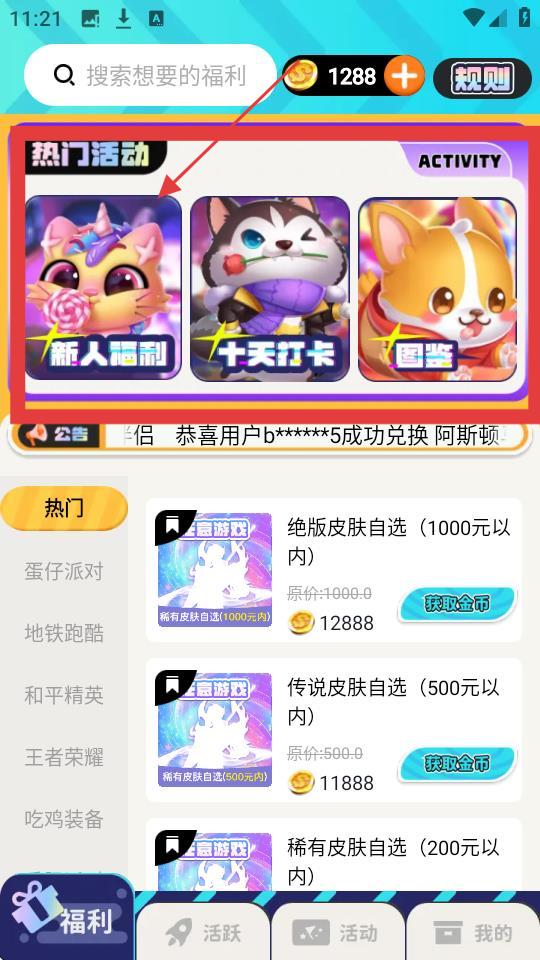 3、开启福利后,可看到不同游戏的皮肤自选等福利,选心仪游戏,点【兑换】,兑换对应福利。