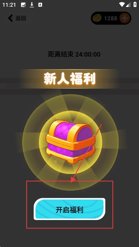 2、在新人福利界面,有倒计时和宝箱,点【开启福利】,开启新人福利,获取福利内容。