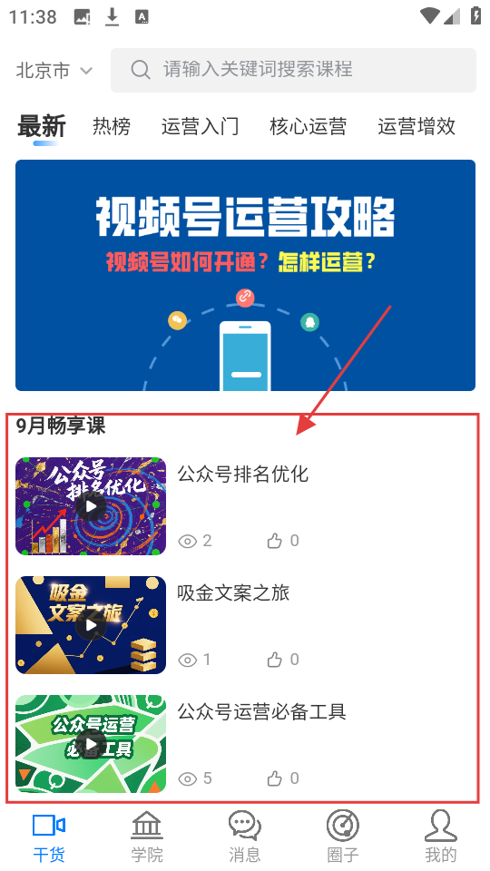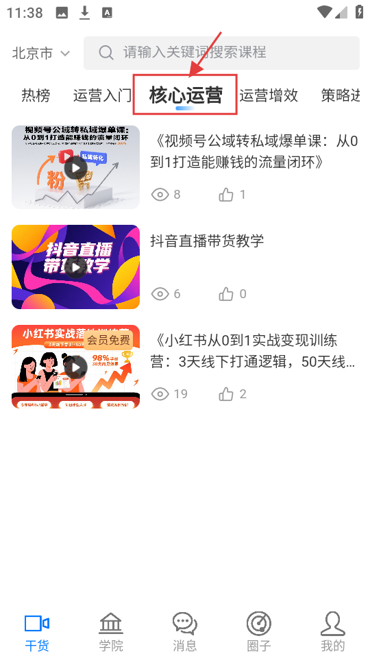 4、回到干货页,还可以选【核心运营】等分类,这里有视频号、抖音直播等核心运营课程,选课程开启学习之旅。