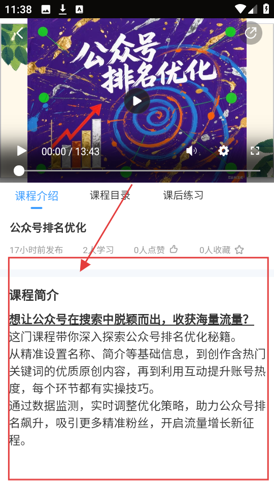 2、在课程详情页,先看【课程介绍】,了解课程能帮公众号在搜索中脱颖而出、收获流量等核心价值。