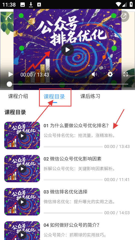 3、看完课程介绍,点【课程目录】,查看各章节内容,如“为什么要做公众号优化排名?”等,选章节学习。