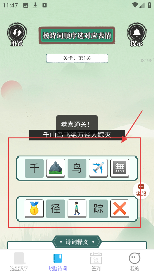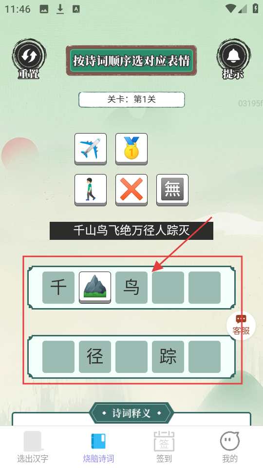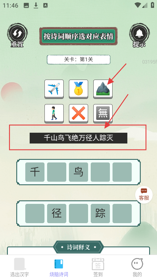 1、进入诗词关卡,需按诗词顺序选对应表情,先看诗词【千山鸟飞绝万径人踪灭】,准备选匹配表情。