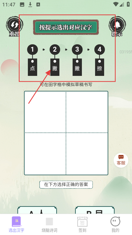 4、进入汉字书写关卡,按提示的笔画顺序【点-撇-撇-捺】,在田字格模拟书写,选正确汉字答案。