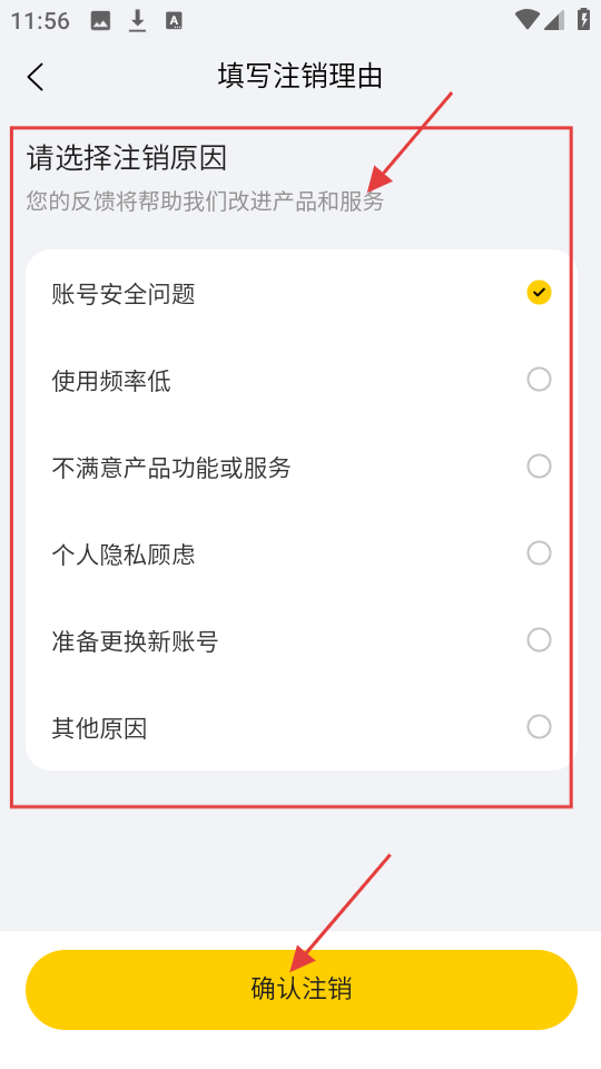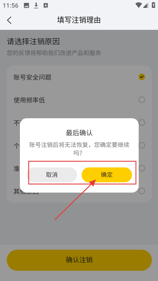 3、进入填写注销理由页,选注销原因,如【账号安全问题】,选好后点【确认注销】,进入最后确认。
