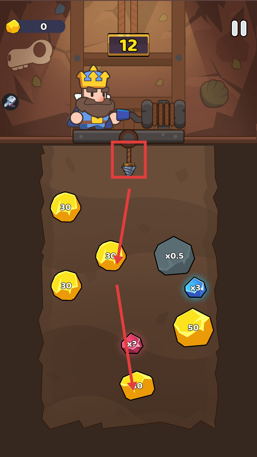 2、在挖矿场景中,操控钻头下落,收集标有【30】【50】等数值的金矿,积累资源用于后续召唤单位。