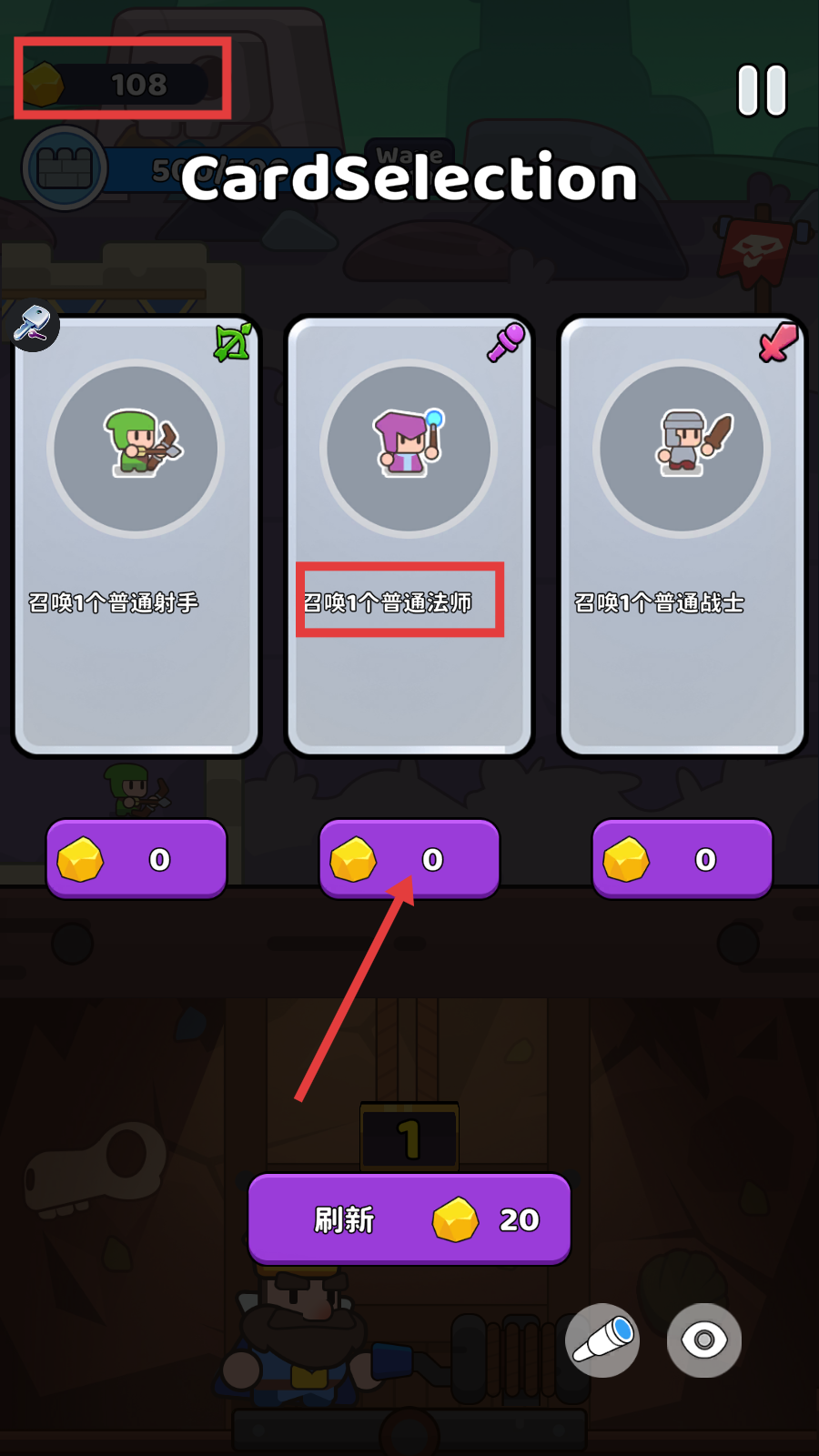 3、在【CardSelection】界面,利用收集到的金矿,选择【召唤1个普通法师】等卡牌,获取战斗单位。
