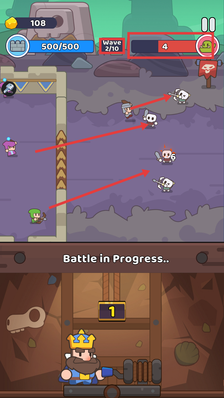 4、战斗时,指挥召唤的射手、战士等单位,在【Wave2/10】波次中对抗敌人,守护城堡(生命值500/500)。