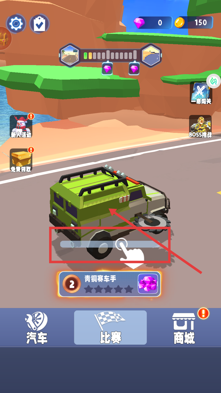 1、进入游戏后,滑动绿色车辆,以【青铜赛车手】身份开启比赛,准备在赛道上竞技。