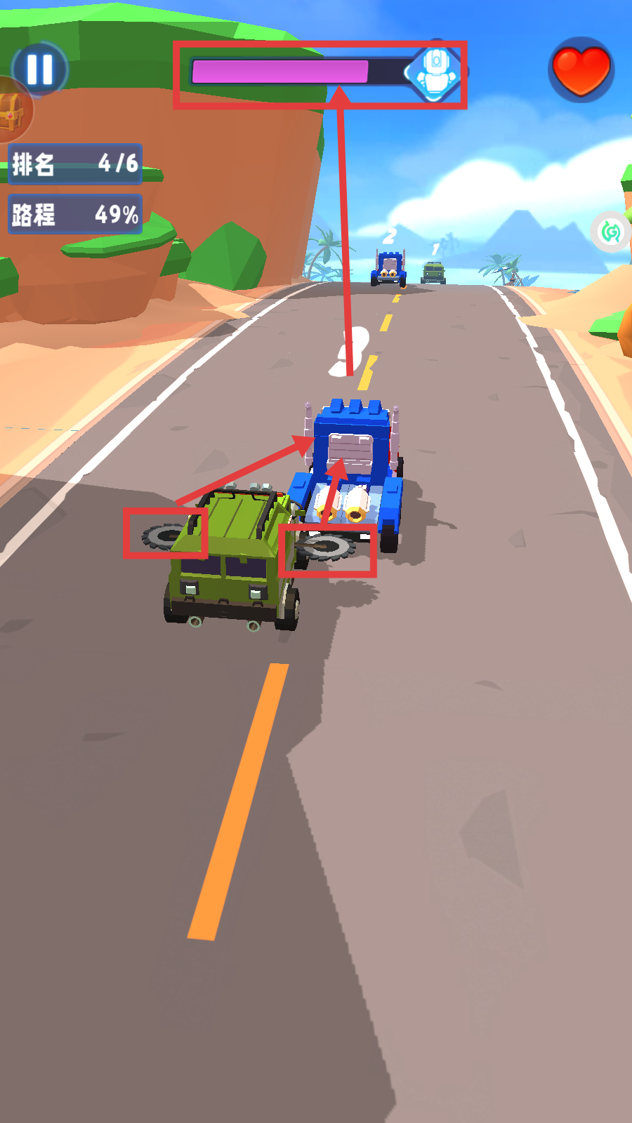 2、比赛中,操控车辆靠近对手(如蓝色车),利用道具攻击,提升上方能量进度条。